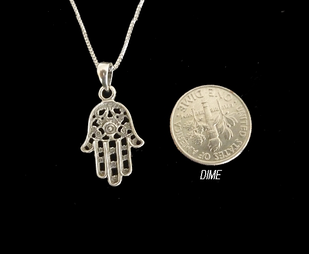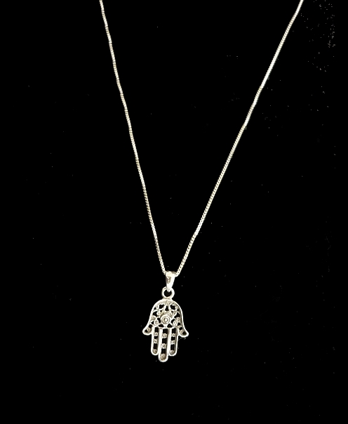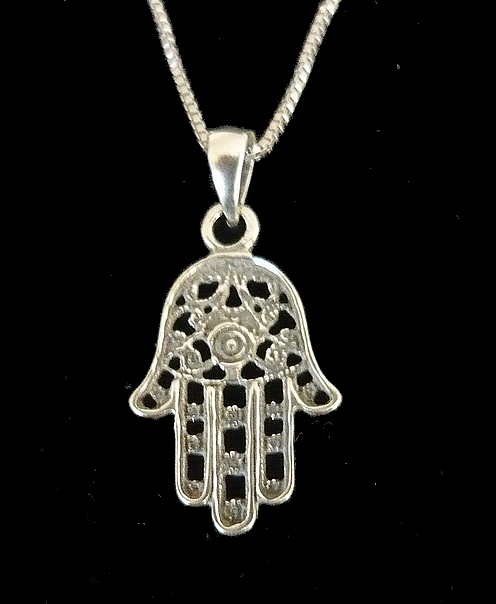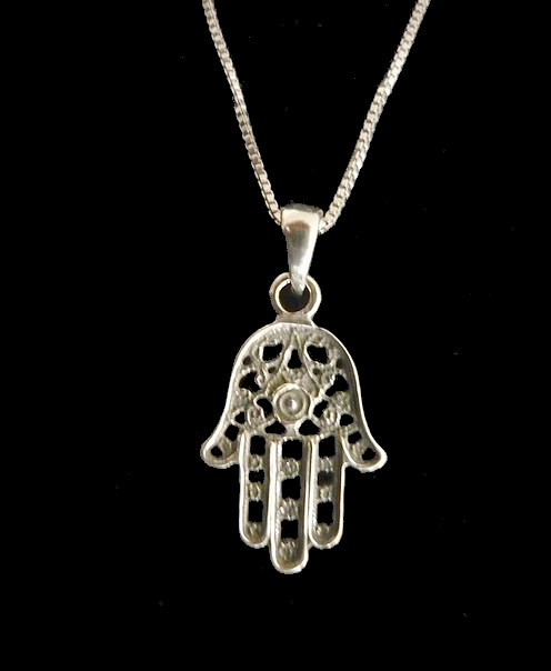 This meaningful sterling silver HAMSA necklace, with elegant detailed cut out swirls and filigree,