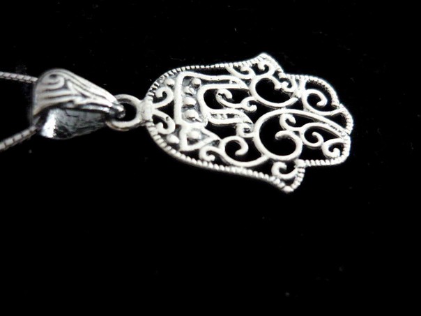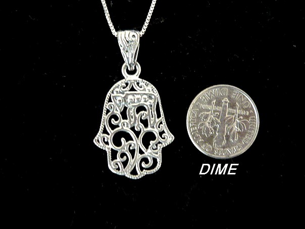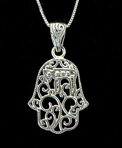 This meaningful sterling silver HAMSA necklace, with elegant detailed cut out swirls and filigree, features the word CHAI in the top, it expresses good wishes and carries the giver's wish of a long life and happiness to the recipient.