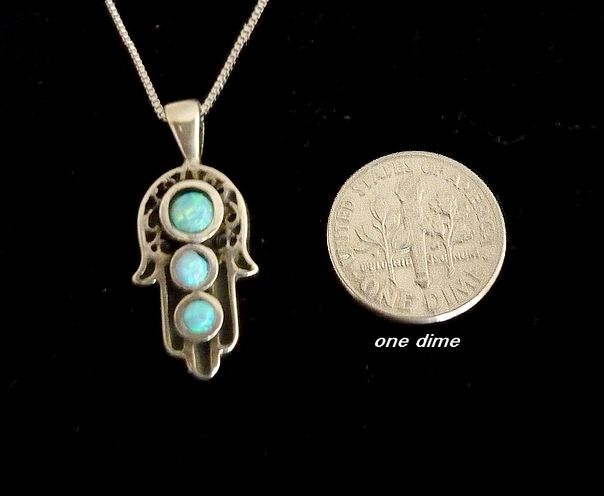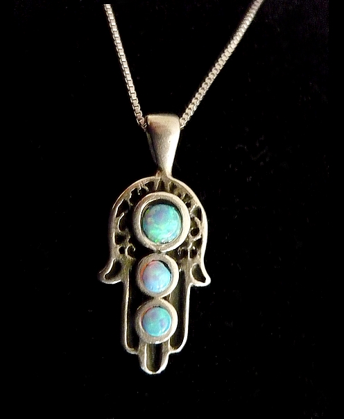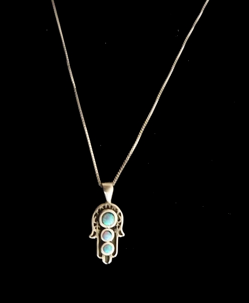 This meaningful sterling silver HAMSA necklace, features cut out swirls and filigree, three blue opal stones adorns the Hamsa adding a gentle touch of color.