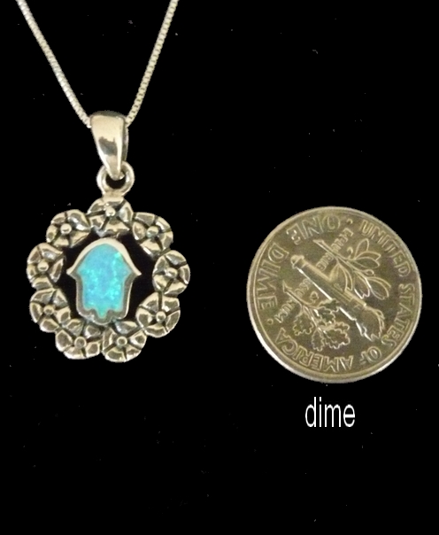 This meaningful sterling silver classic HAMSA necklace covered with a blue opal ,, on a circular pendant, symbolic of eternity, totality and wholeness, adding a gentle spiritual touch , making this a special gift.