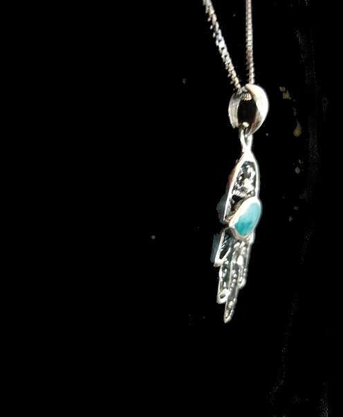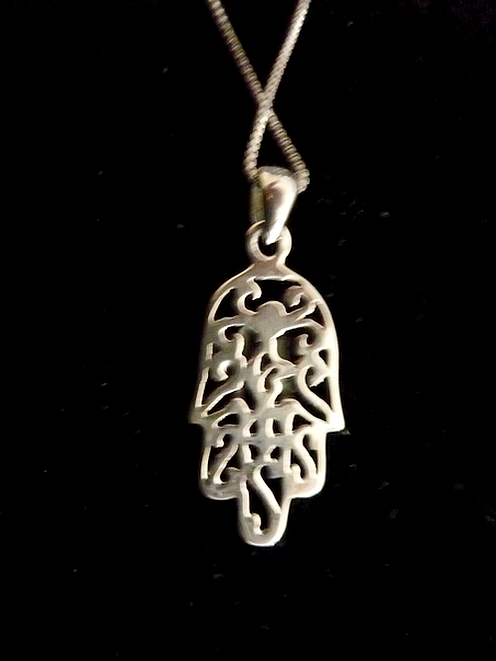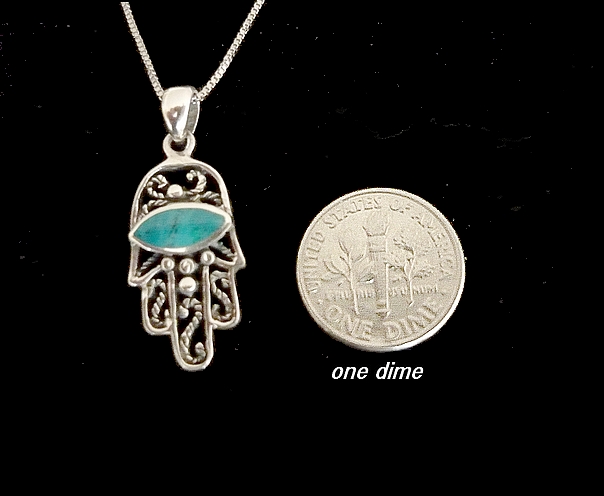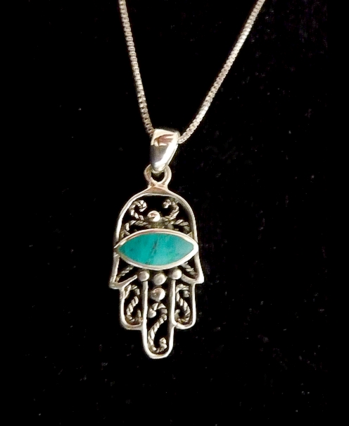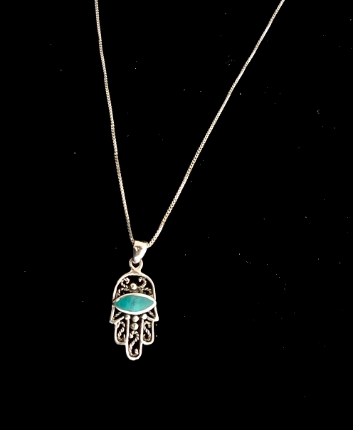 This meaningful sterling silver HAMSA necklace, features cut out swirls and filigree, a green Eilat stone adorns the hamsa adding a gentle touch of color