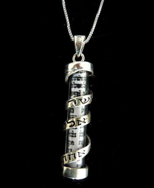 This meaningful unisex sterling silver Mezuza pendant, has a clear case, and it shows the scroll inside, it has a silver filled band wound down his length , reminiscent of a Tefillin strap . The sentence Shema Israel, appear on the front. The pendant measures 4 cms. Comes on a 22" sterling silver box chain .