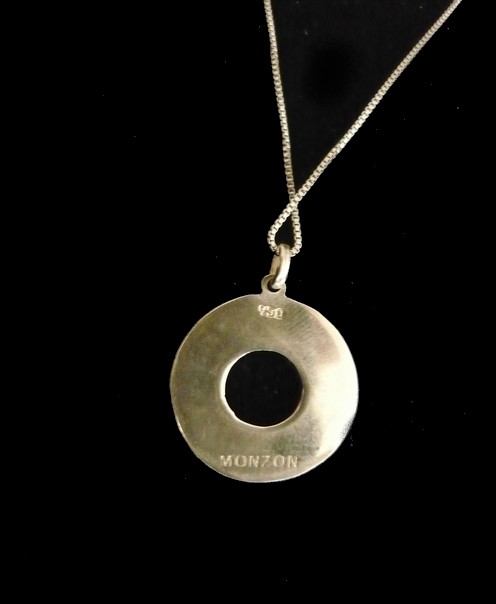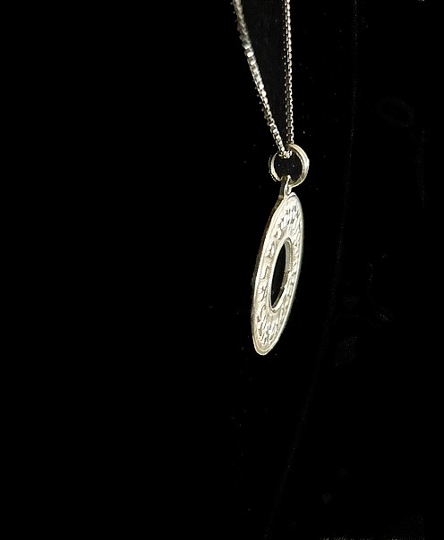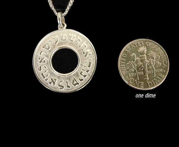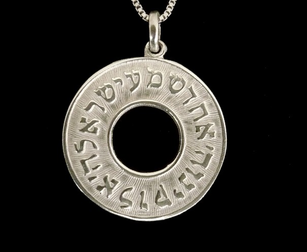 This meaningful sterling silver, 2.2 cms diameter, unisex circular SHEMA ISRAEL necklace, symbolic of eternity, totality , and wholeness, bears the prayer, and reads, Shema Israel, Adonai Elokeinu Adonai Echad. (Hear, O Israel, Hashem is our G-d, Hashem is One) (Deuteronomy 6:4),
