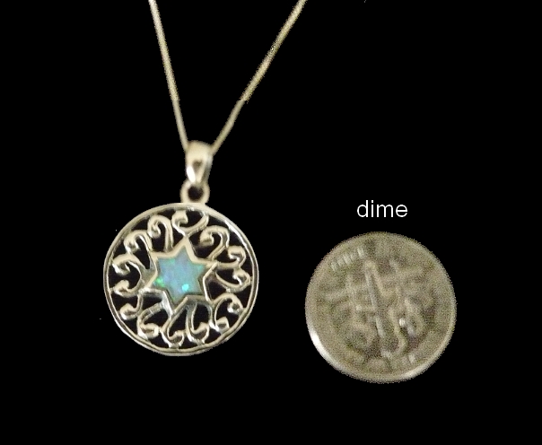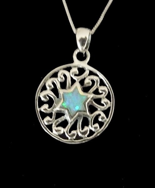 This meaningful sterling silver classic Star of David, necklace, on a circular pendant, symbolic of eternity, totality and wholeness, with a blue opal stone that adorns the Star of David, featuring cut out swirls adding a gentle touch of color and texture.