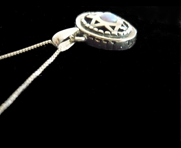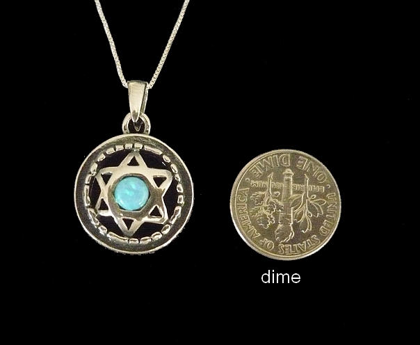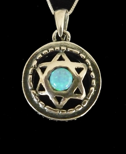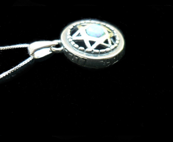 This meaningful sterling silver classic Star of David, necklace, on a circular pendant, symbolic of eternity, totality and wholeness, with a blue opal stone that adorns the Star of David, adding a gentle touch of color.