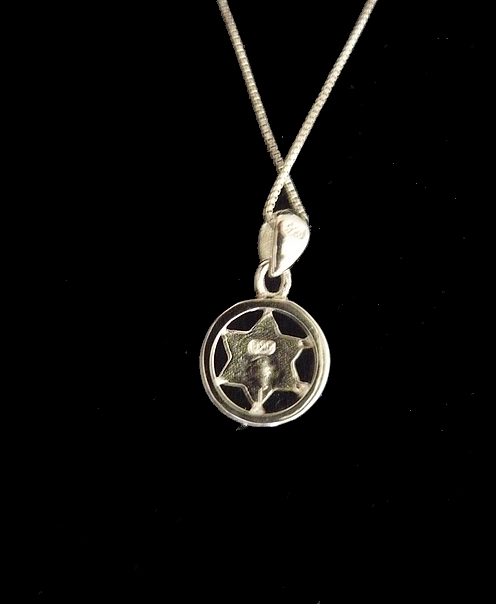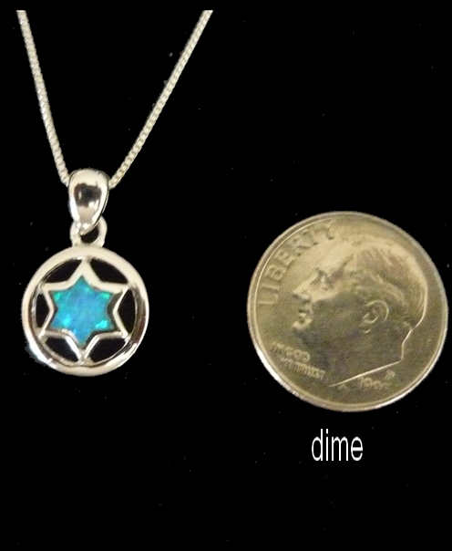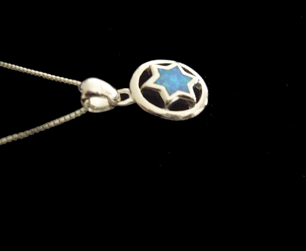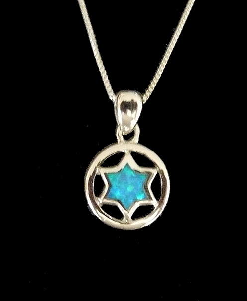 This meaningful sterling silver classic Star of David, necklace, on a circular pendant, symbolic of eternity, totality and wholeness, with a blue opal stone that adorns the Star of David, adding a gentle touch of color.