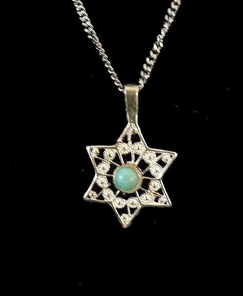 .his meaningful classic sterling silver STAR OF DAVID necklace w turquoise stone , with a smooth finish . This necklace is something anyone would love to wear. The Star of David is a six pointed figure that has two interlaced triangles. This symbol universally represents the connection of the soul with the Creator through study and learning the teachings of Kabbalah. The star of David shows great strength and perseverance.