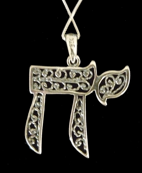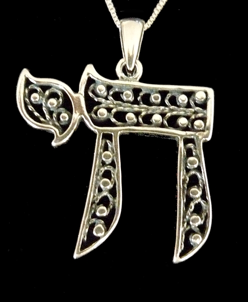 This meaningful sterling silver CHAI necklace. the Hebrew word for "Life", features cut out swirls and filigree adding to this design texture. This necklace is something anyone would love to wear.