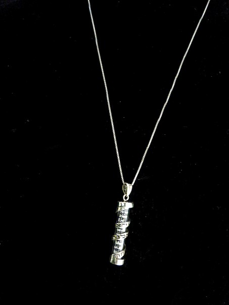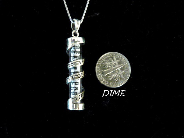 This meaningful unisex sterling silver Mezuza pendant, has a clear case, and it shows the scroll inside, it has a silver filled band wound down his length , reminiscent of a Tefillin strap . The sentence Shema Israel, appear on the front. The pendant measures 4 cms. Comes on a 22" sterling silver box chain .
