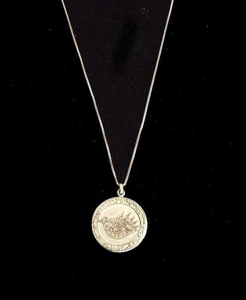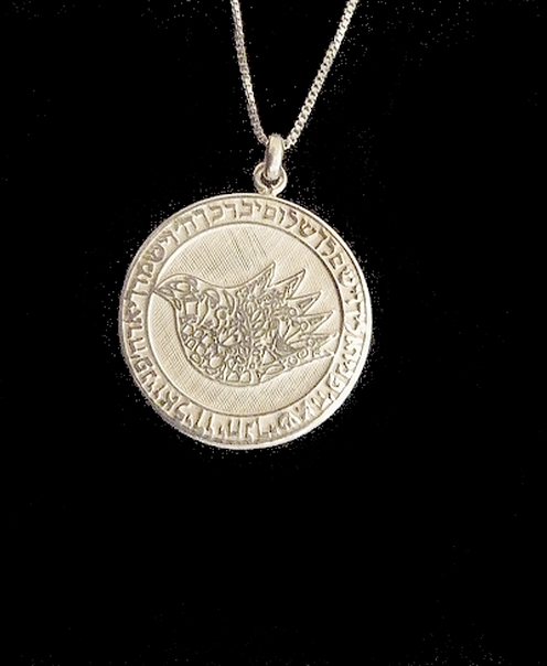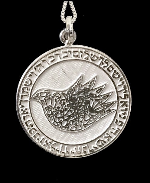 This meaningful sterling silver medallion Dove of Peace, necklace, bears the Priestly Blessing, (Birkhat HaCohanim). The Hebrew text is texture imprinted on a circular pendant, symbolic of eternity, totality,and wholeness. It reads " May G-d bless and keep you, may G-d shine light upon you and be good to you, may G-d look upon you and grant you peace". The dove features leaves, flowers, and jewish symbols.