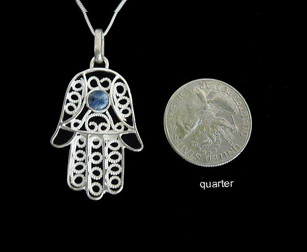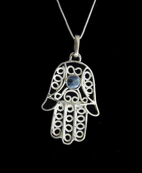 blue lapis lazuli stone in the front that adorns the hamsa adding a