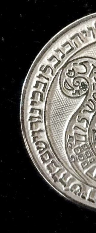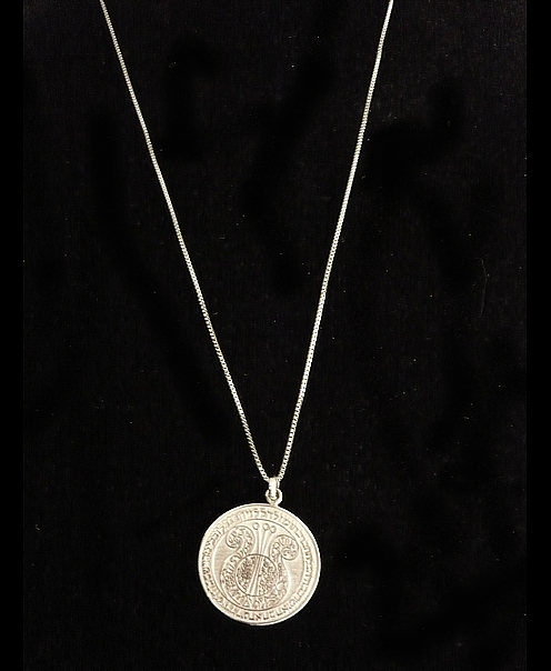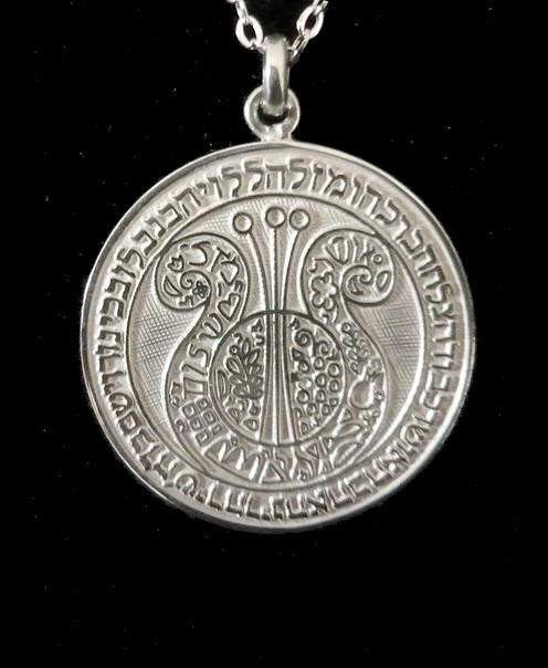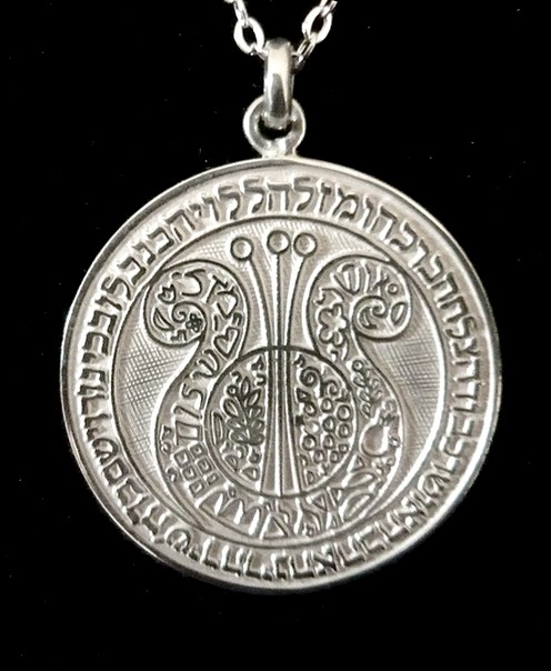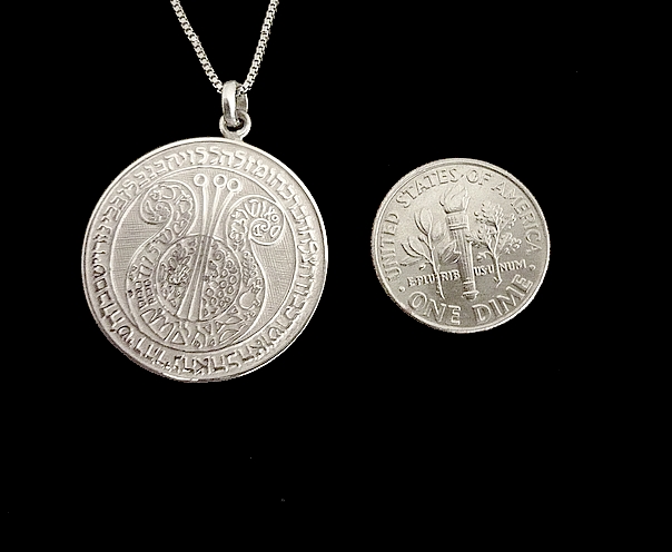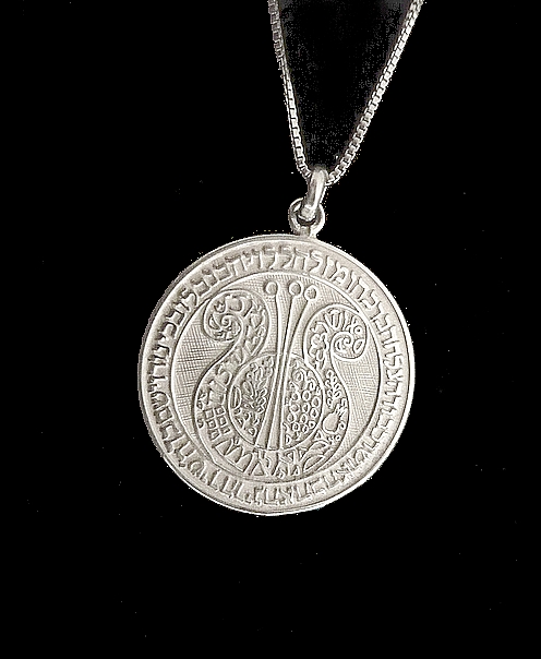 This meaningful sterling silver necklace, Harp of David, bears a Blessing. The Hebrew text is texture imprinted on a circular pendant, symbolic of eternity, totality, and wholeness. It reads "Halleluyah with a Harp and a violin, G-d will grant you with Poetry, Joy, Love, Happiness, Respect, Success, Blessing and Luck ". The Harp of David features leaves, pomegranates, bird, flowers, jewish symbols, the words Shalom (Peace), Osher (Happiness).,Mazal (Luck), and Chai (Life).
