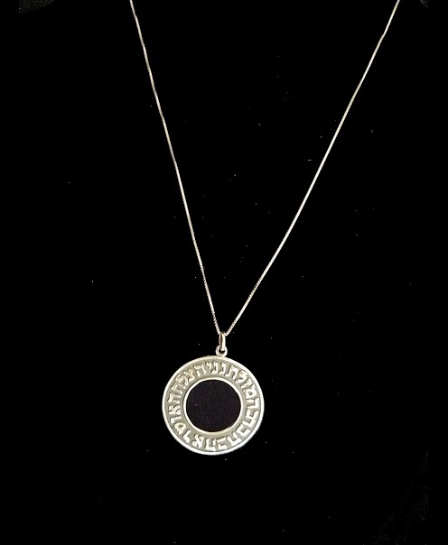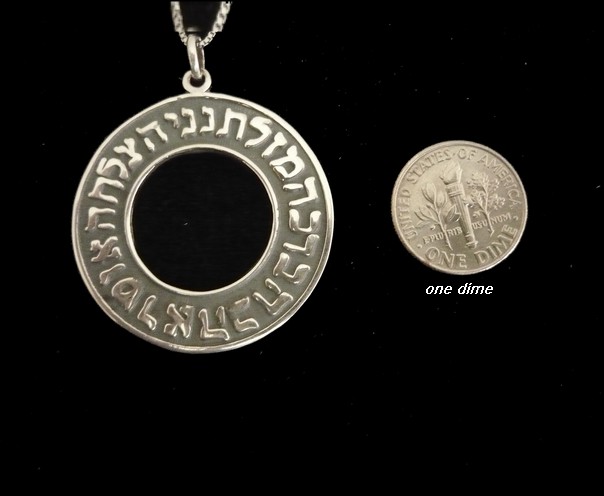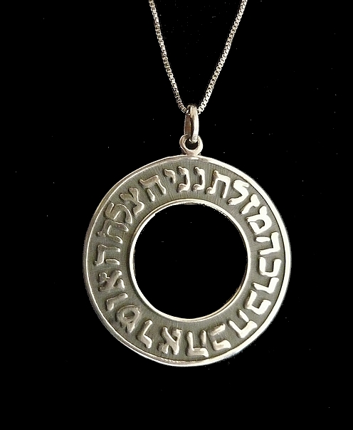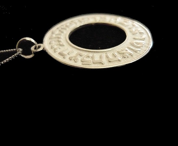 This meaningful unisex sterling silver, 3.3 cms diameter, circular TNENI necklace, texture imprinted, text that reads,. TNENI (Give me), HATZLACHA (Success), OSHER (Happiness), AHAVA (Love), BRACHA (Blessing) and MAZAL (Luck).