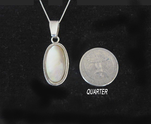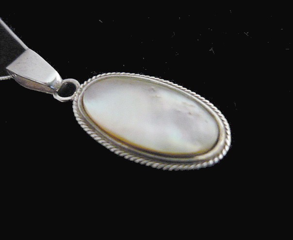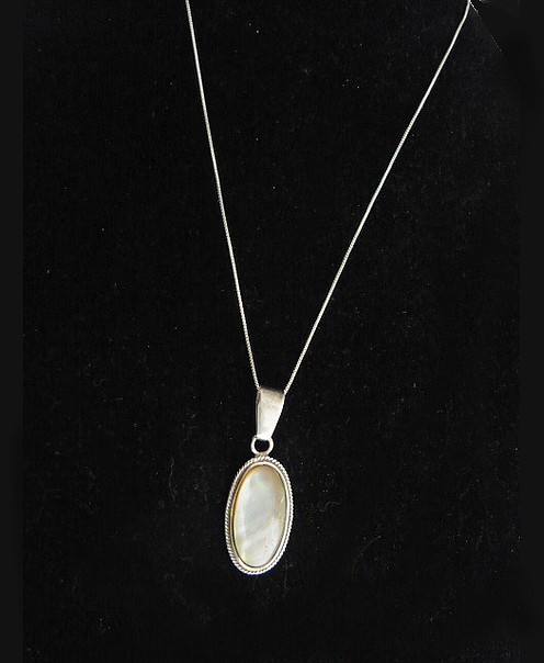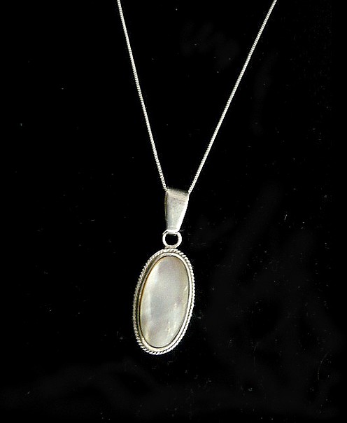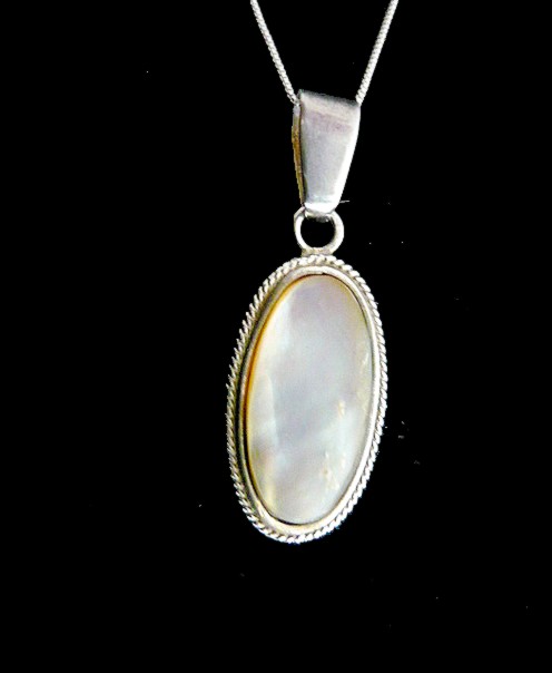 This stunning Oval sterling silver necklace with Mother Pearl a member of the same group of shellfish as scallops and clams, has been used decoratively for many years. The Mother Pearl is the focal point of this handcrafted necklace. The stone is wrapped in solid sterling silver wire and it is accented with a twisted rope design.