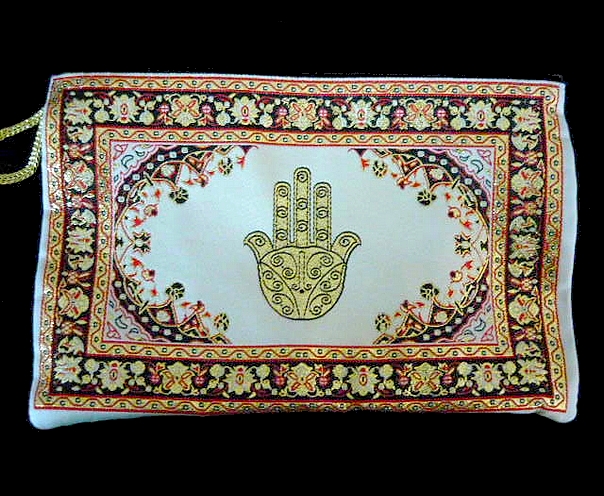 This beautiful bag, features the HAMSA design, is woven of polyester jacquard fabric, with rich gold embellishments.