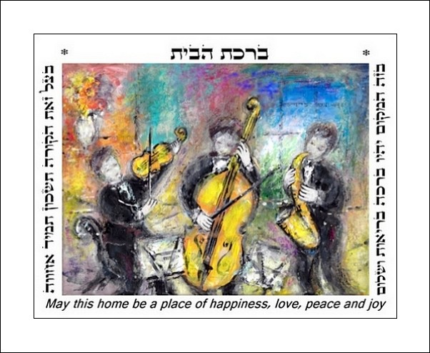An original giclee lithograph made and signed one by one by the artist Moshe Monzon. This beautiful giclee with the musicians, has a meaningful Home Blessing in the frame. "In this place will be Blessings, Health and Peace". " Under this roof will be always companionship".