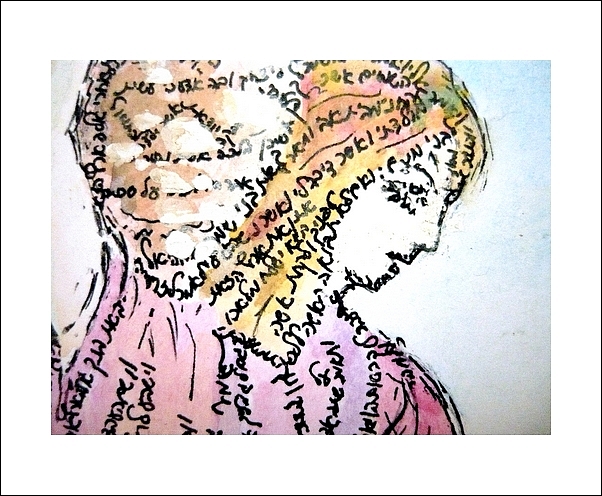This microcalligraphy features the story of "REBECCA"This form of artwork is created from Biblical texts that forms and image when viewed from a distance. This is an ancient Jewish form of embellishment the Biblical texts, the purpose of this type of art, was to preserve and stabilize the accuracy of the Sacred texts.