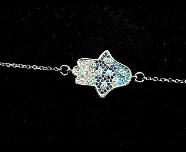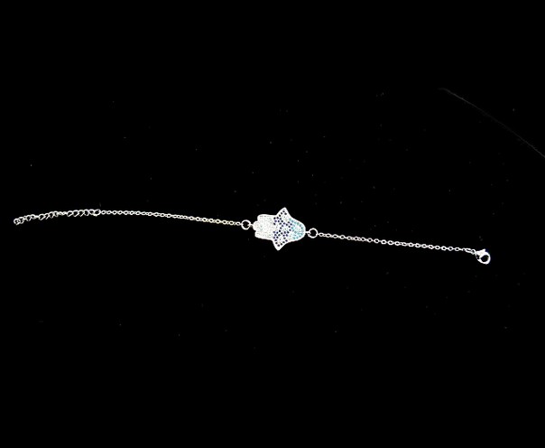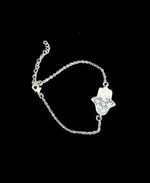 This delicate silver filled bracelet, is a sweet expression of love. A Hamsa design with lucky eyes enhanced with enamel and two tone blue crystals , that represents protection and the white represents spirituality, purity and judgement, on a simple chain of 16cms, it has an additional link of 5 cms that allows you to adjust the size of the bracelet, making this an adaptable piece. Measures 2 cms x 1.5 cms,