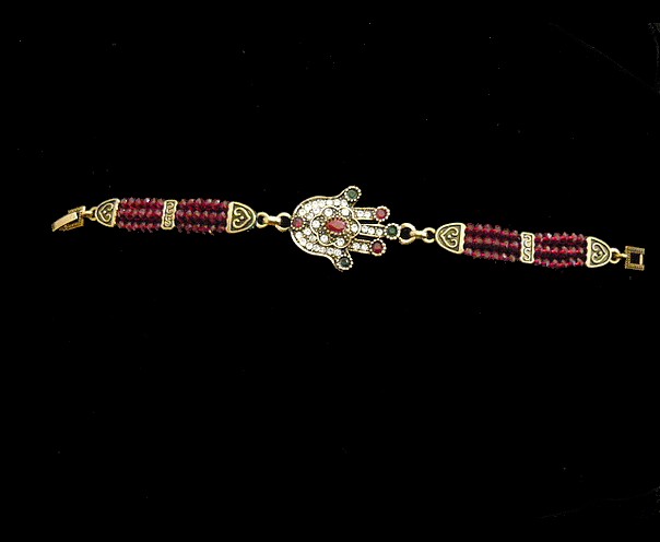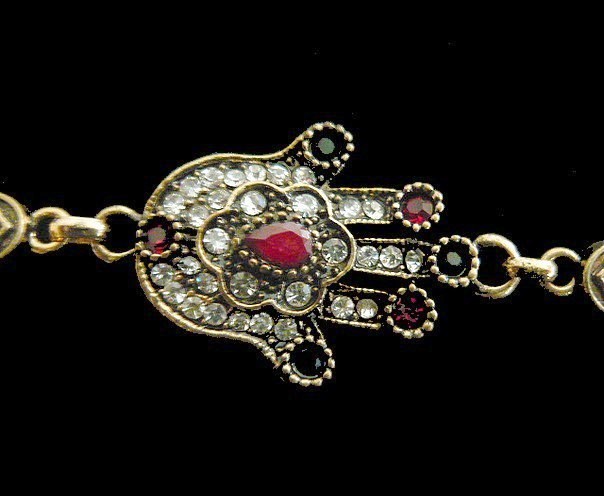 This stunning traditional design HAMSA bracelet, gold brass, encrusted with crystals, the color white represents spirituality, purity and judgement, the red represents romance, and the black transforms everything to positive.