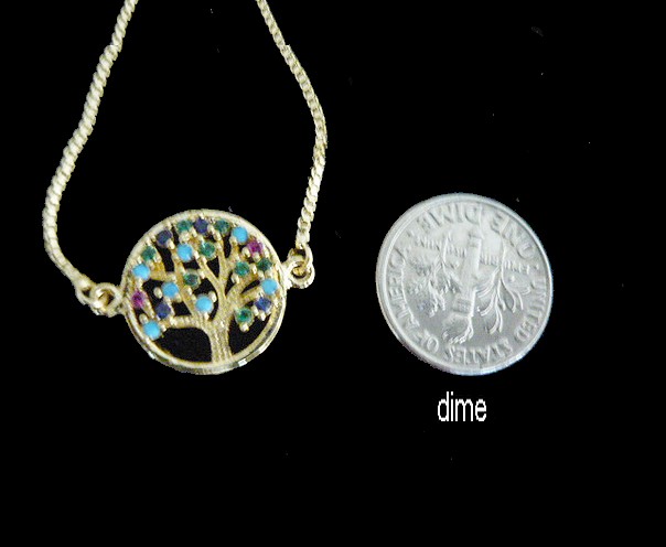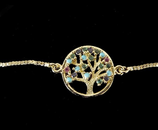 `This delicate TREE OF LIFE gold filled bracelet, on a circular shape, is a symbol of eternity, totality and wholeness, encrusted with crystal stones , the green color represents finance, the blue represents protection , and the red represents romance.