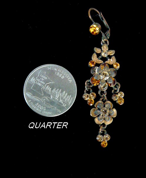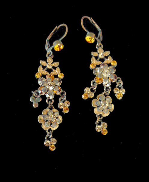 These beautiful floral chandelier earrings, featuring amber color crystal stones, are very light.