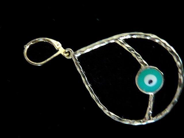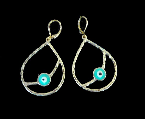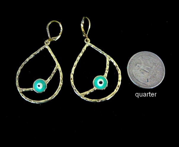 These beautiful drop shape earrings, featuring a turquoise color enamel lucky eye, are very light.