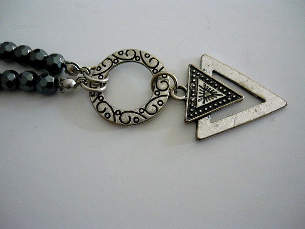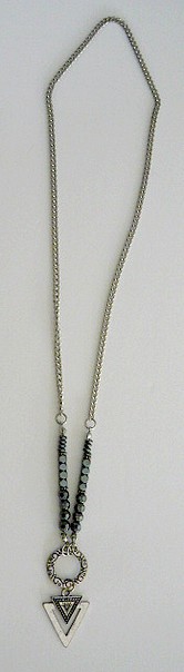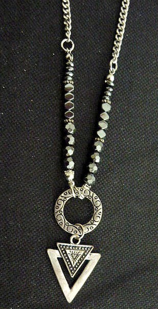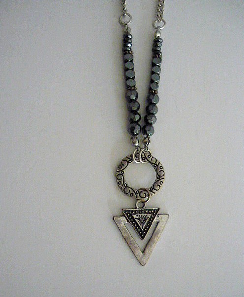 This meaningful ethnic design necklace, features a circle and two triangles with cut out swirls that adorns the pendant adding a gentle touch of color and texture.