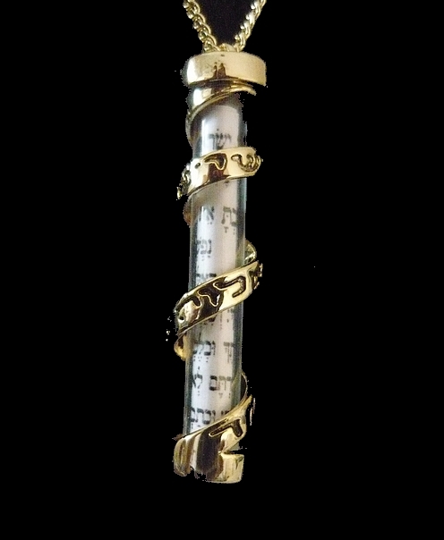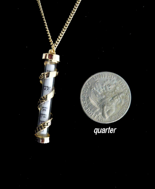 This meaningful unisex gold filled Mezuza pendant, has a clear case, and it shows the scroll inside, it has a gold filled band wound down his length , reminiscent of a tefillin strap . The sentence Shema Israel, appear on the front. The pendant measures 4 cms. Comes on a 24" chain. plus 2" extension.