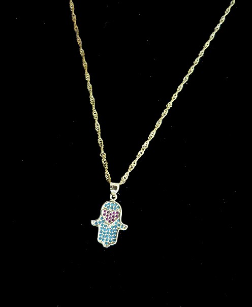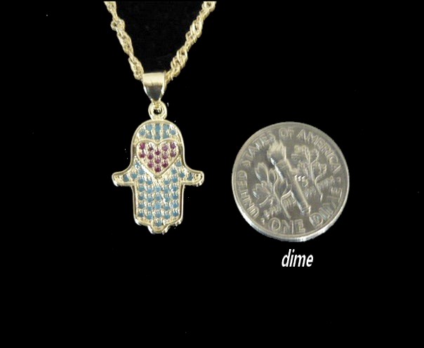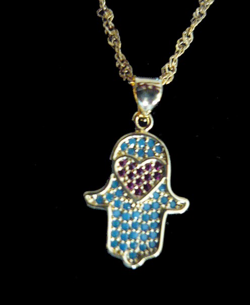 This meaningful gold filled Hamsa necklace, with a heart shape encrusted with turquoise and red crystal stones color which represents protection and romance, comes on a 16" chain, and 2" extension.