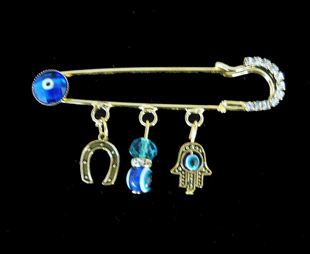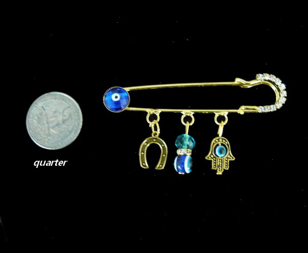 This stunning good luck blue eye , hamsa and horseshoe pin , is both a great accessory and a symbol of protection. It is gold tone enhanced with black enamel and white crystals.