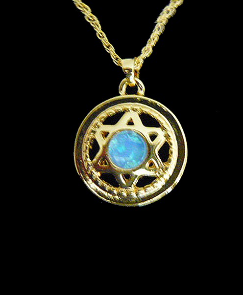 This meaningful modern gold filled STAR OF DAVID necklace on a circular pendant, symbolic of eternity, totality, and wholeness, with the blue stone in the front shows Spirituality, Purity and Judgement. The Star of David is a six pointed figure that has two interlaced triangles. This symbol universally represents the connection of the soul with the Creator through study and learning the teachings of the Kabbalah. The Star of David shows great strength and perseverance.