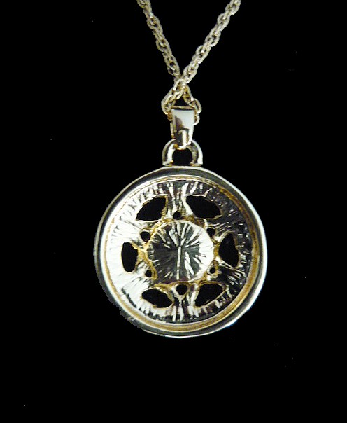 It comes on a 16" chain. with 2" extension Pendant size is 2 cms diameter.