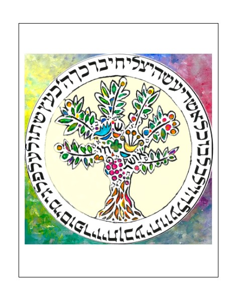 This meaningful giclee Tree of Life, bears a Blessing. The Hebrew text is printed on a circular shape, symbolic of eternity, totality, and wholeness. It reads " ". The Tree of Life, features leaves, pomegranates, bird, flowers, jewish symbols, the word Osher (Happiness) and Chai (Life).