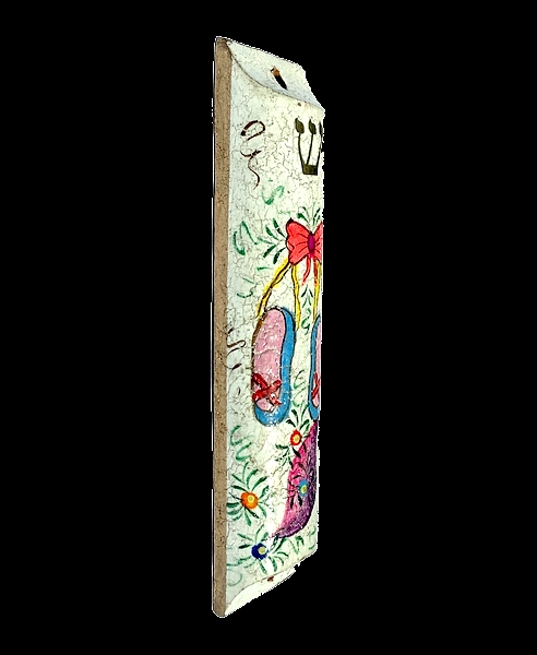 The mezuzah case is painted with oil colors and coated with a special Varnish to Protect fading and any possible water damage