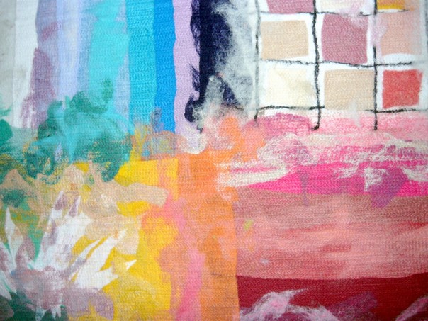made by the artist Moshe Monzon, is made as a collage of synthetic fibers then woven in a special needle loom that weaves all the layers together.