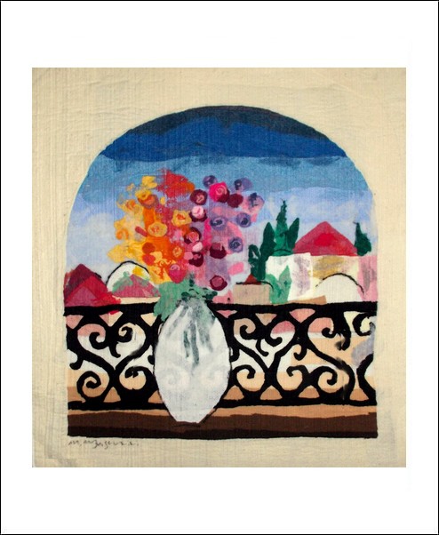made by the artist Moshe Monzon, is made as a collage of synthetic fibers then woven in a special needle loom that weaves all the layers together. This beautiful design depicts a vivid vase of flowers in a typical Jerusalem balcony, facing the city. The background is a beige color.