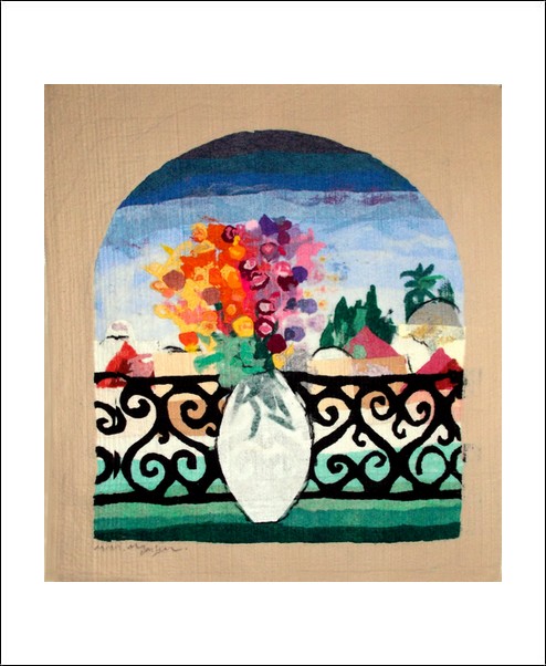made by the artist Moshe Monzon, is made as a collage of synthetic fibers then woven in a special needle loom that weaves all the layers together. This beautiful design depicts a vivid vase of flowers in a typical Jerusalem balcony, facing the city. The background is a Taupe color.