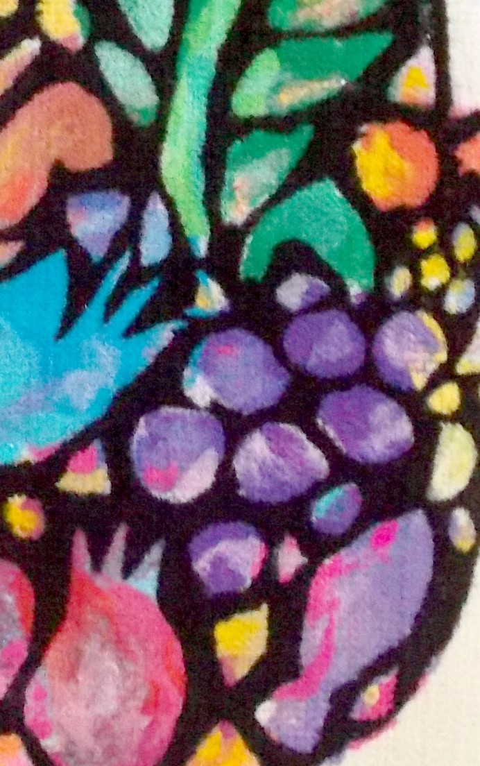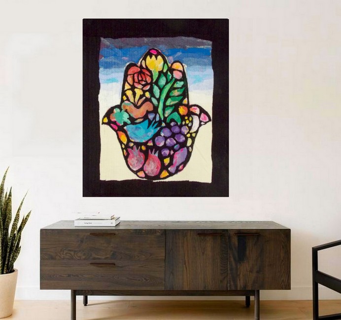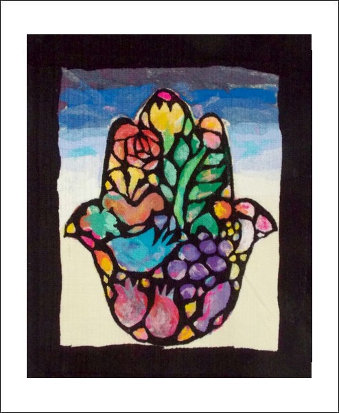 A window with a black border and a beautiful hamsah with hidden symbols of nature and freedom in bright colors- Hamsa is a symbol of luck and protection from the time of kabbalah