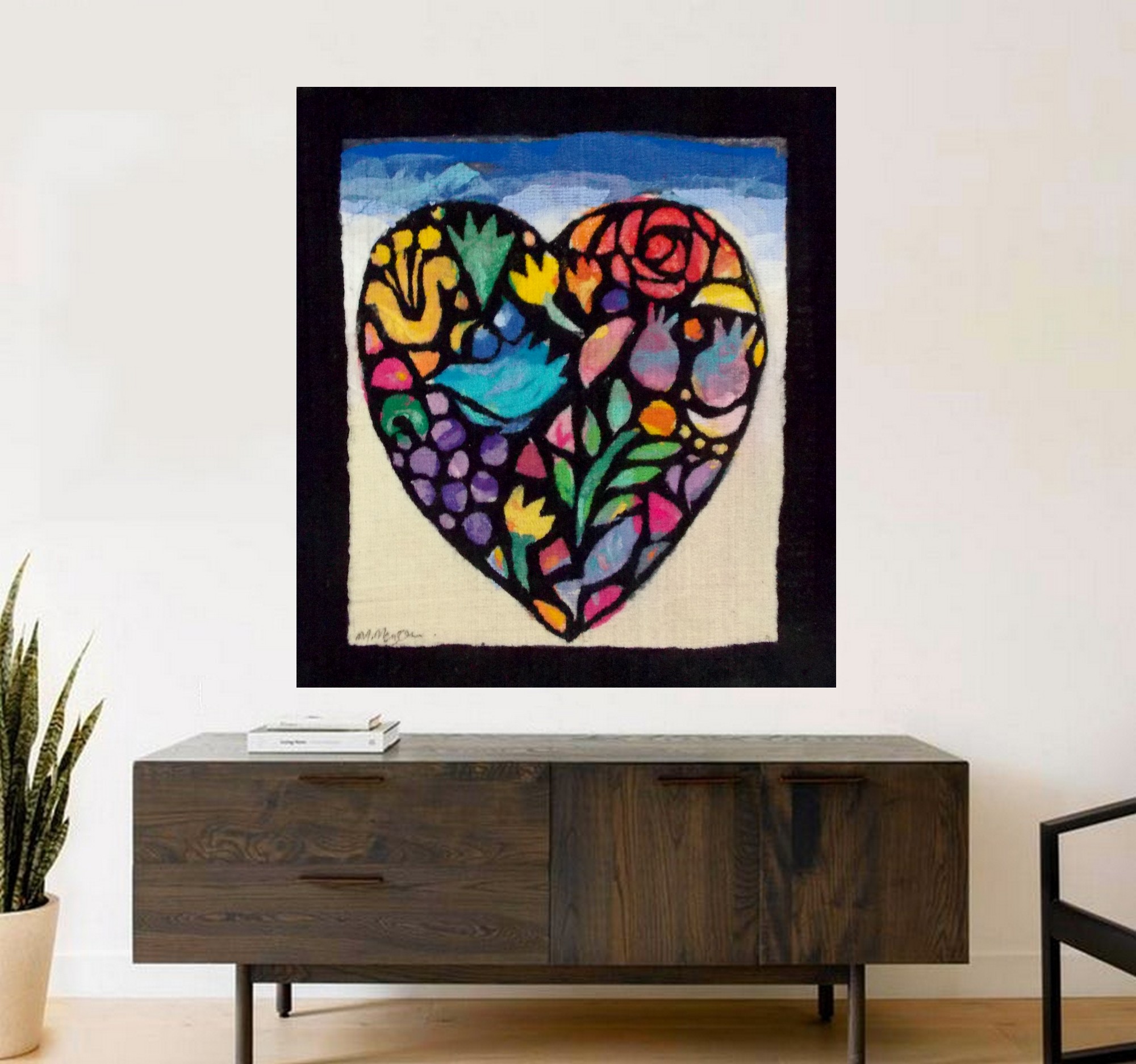 A window with a black border and a beautiful heart with hidden symbols of nature and freedom in bright colors-