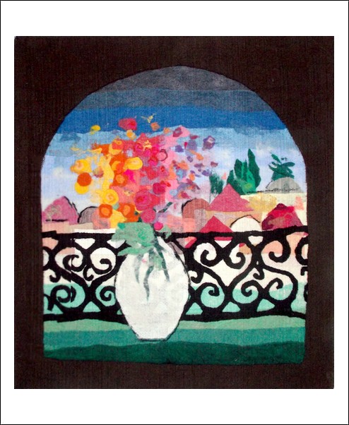 made by the artist Moshe Monzon, is made as a collage of synthetic fibers then woven in a special needle loom that weaves all the layers together. This beautiful design depicts a vivid vase of flowers in a typical Jerusalem balcony, facing the city. The background is a Taupe color.