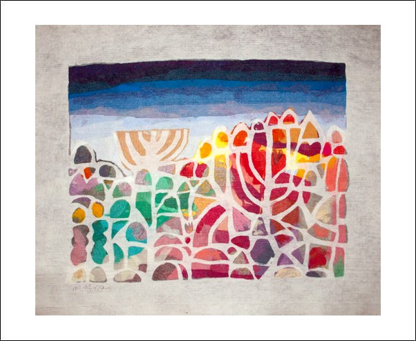 This unique hand crafted original Tapestry made by the artist Moshe Monzon, is made as a collage of synthetic fibers then woven in a special needle loom that weaves all the layers together. This unique tapestry depicts two Menorah candlesticks, forming the rooftops of Jerusalem, in the interior of the design you can see Shabath Candles, the 10 Commandments, and a Star of David.