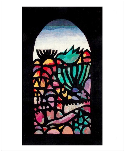 made by the artist Moshe Monzon, is made as a collage of synthetic fibers then woven in a special needle loom that weaves all the layers together. This beautiful tapestry depicts different Jewish symbols as the Menorah, Dove of Peace, Shabath candles, Star of David, a Fish, Pomegranate, Shofar, and the walls of the City of Jerusalem.