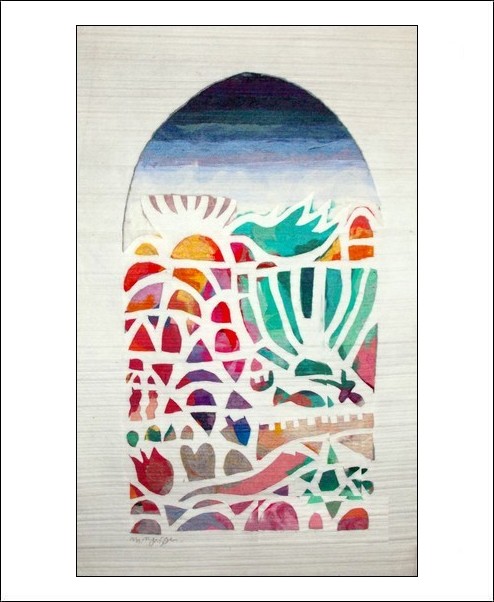 made by the artist Moshe Monzon, is made as a collage of synthetic fibers then woven in a special needle loom that weaves all the layers together. This beautiful tapestry depicts different Jewish Symbols as the Menorah, Dove of Peace, Shabat Candles, Star of David, the Letter Shin, a Fish, Dreidel, Pomegranate, Shofar, Ten Commandments, and the Wall of the City of Jerusalem.