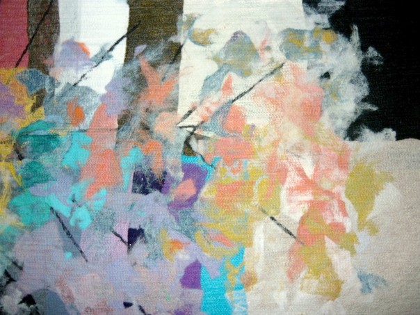 made by the artist Moshe Monzon, is made as a collage of synthetic fibers then woven in a special needle loom that weaves all the layers together.