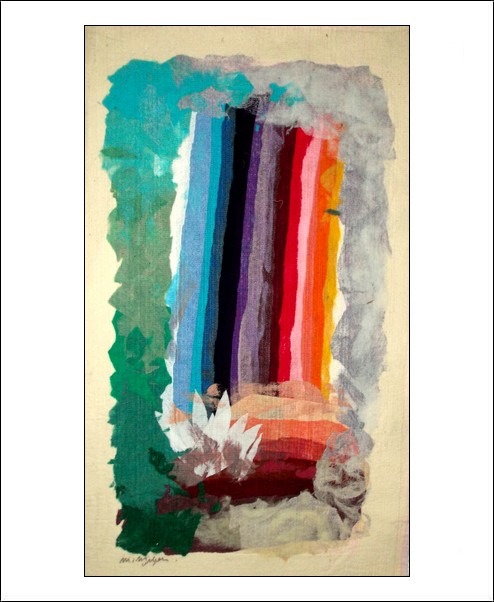 made by the artist Moshe Monzon, is made as a collage of synthetic fibers then woven in a special needle loom that weaves all the layers together. This unique design called Paradise features the Water Fall and the rainbow colors. It has a beige background.