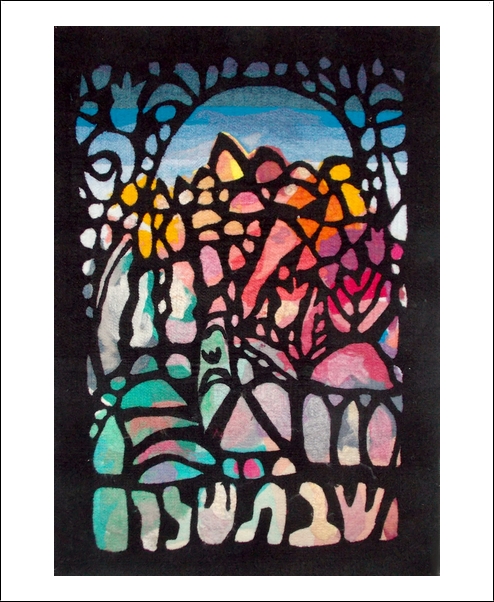 made by the artist Moshe Monzon, is made as a collage of synthetic fibers then woven in a special needle loom that weaves all the layers together.
