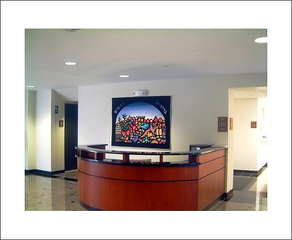 This beautiful tapestry Bruchim Habaim Jerusalem Window, was commissioned to hang a the guest entrance of Temple Beth Shalom in Livingston, New Jersey. The size of the tapestry is 4' x 5'. The background is black, the design depicts different hidden jewish symbols.