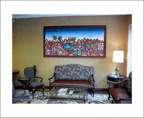 This beautiful Jerusalem Window tapestry, was commissioned to hang at the waiting room at the Mount Lebanon Jewish Cemetery in Glendale, New York.