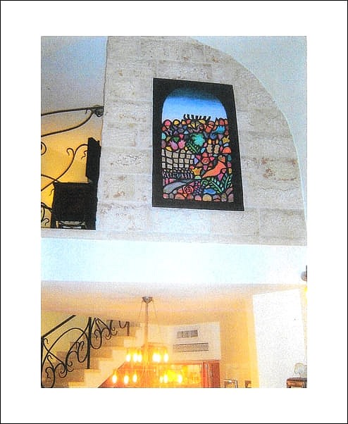 This beautiful tapestry featuring a Jerusalem window with hidden symbols inside, is hanging in a private home in Petach Tikva, Israel. It has a black background. The size of the tapestry is 4' x 6'/